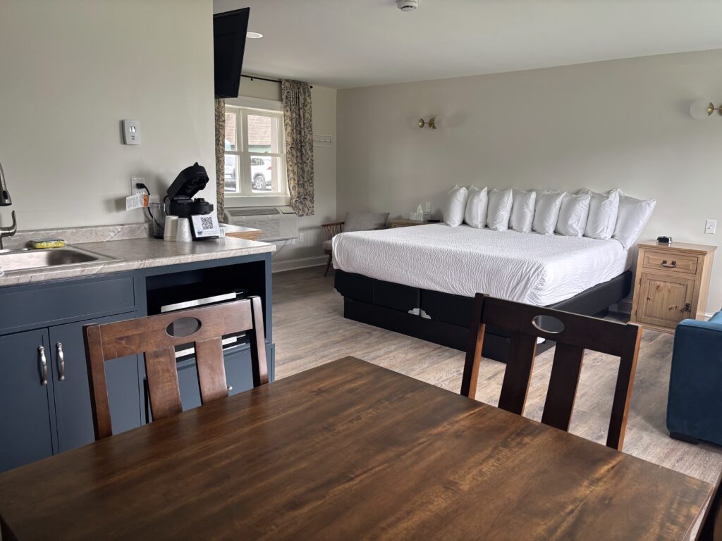 Designed for a Northwoods Couple’s Getaway. Our King Suite includes free wifi, a smart TV and kitchenette. Sip coffee on the couch or step outside onto the private deck for a view of Moosehead Lake.